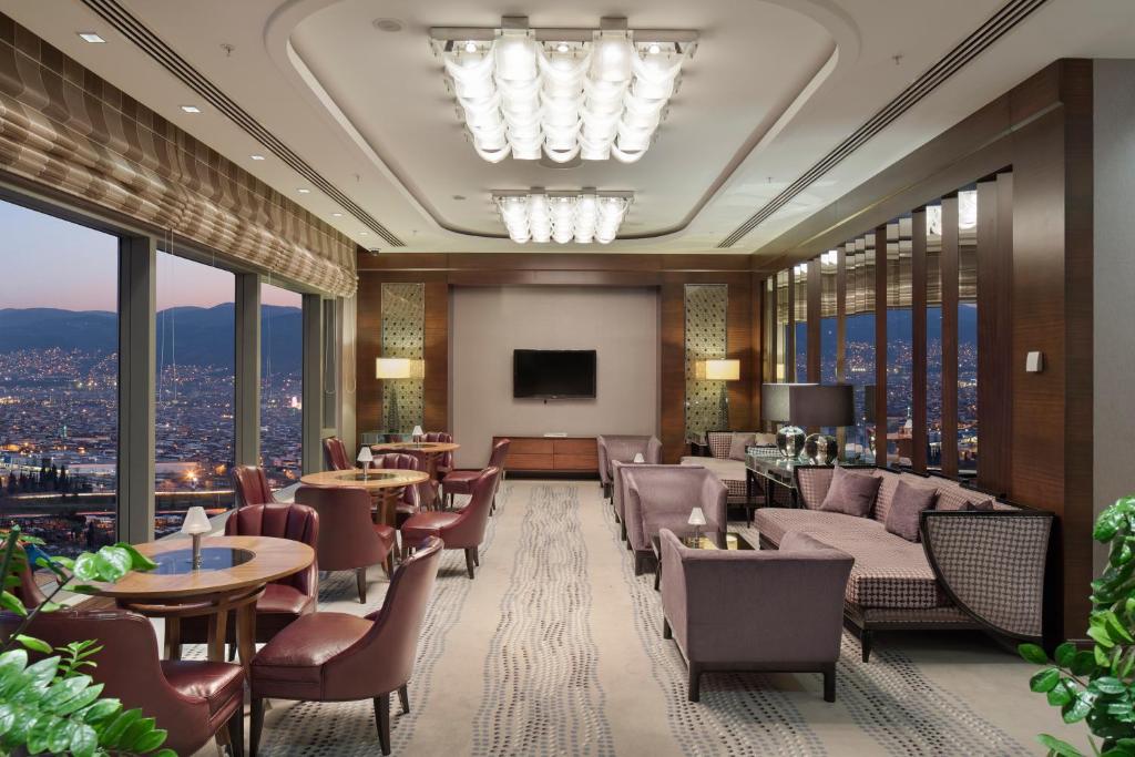 يقع فندق هيلتون بورصا المصنف 5 نجوم على بعد 4 كم من وسط المدينة وبجوار مول أوزديليك بارك للتسوق ويطل على جبل أولوداغ، فيما تتوفر خدمة الواي فاي مجاناً في جميع أنحاء مكان الإقامة، وقد حاز هذا الفندق الصديق للبيئة على غرين ستار سيرتيفيكيت في عام 2015، وجائزة فندق لوكشري آرت في عام 2016. تم منح فندق هيلتون بورصا جائزة أفضل فندق أعمال من قبل ترافيل آند هوسبيتاليتي أووردز في تركيا، كما تتميز جميع غرفه بتكييف الهواء وتلفزيون بشاشة مسطحة وميني بار وآلة لصنع القهوة، فيما تتوفر حمامات خاصة مزودة بدش ورداء حمام ومجفف للشعر ولوازم استحمام مجانية. يضم مركز سبا وعافية أنيتا الذي حاز على جوائز سبا وورلد لكشري في عام 2016 مركز حديث للياقة البدنية ويوفر إطلالة على جبل أولوداغ، كما يمكن للضيوف زيارة الساونا أو غرفة البخار للاسترخاء، فيما يمكن ترتيب جلسات المساج. يقدم مطعم Brasserie بوفيه إفطار وغداء، ويشمل قائمة مأكولات إيطالية طوال اليوم، ويمكنكم أيضاً الاستمتاع بوجبات طعام من المأكولات العالمية في مطعم Skylight الموجود في الطابق 18، كما توفر صالة الأتريوم المقبلات، في حين يقدم Patisserie Vivienne مجموعة متنوعة من الشوكولاتة والكعك اللذيذ. تتوفر أجهزة محاكاة لسيارات السباق بالحجم الطبيعي في الطابق الـ19. يقع ميناء غوزاليالي آي دي أو للعبّارات على بعد 20 دقيقة بالسيارة، كما يقع منتزه أولوداغ الوطني ومركز للتزلج على بعد 45 دقيقة بالسيارة، في حين يمكنكم الوصول إلى البازار الكبير ومسجد أولو وكوزا إن في غضون 10 دقائق بالسيارة، فيما يقع الفندق على بعد 54 كم من مطار بورصا و116 كم من مطار إسطنبول صبيحة جوكتشن الدولي، وتتوفر مواقف خاصة مجانية للسيارات.